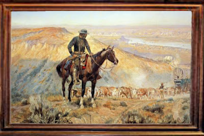 Of course that lead me down another rabbit hole and I discovered her grandson was the famous American artist of the American Old West, Charles Marion Russell. Also known as C.M. Russell, Charlie Russell or Kid Russell. Here's where my story comes full circle. When I was a child, my father worked as a furniture repairman at "Heath Furniture Store" in Amarillo, Texas. Our home was always decorated with the most fashionable Early American Furniture, upholstered with the most plush earth toned velvet fabrics. A large framed print of a Charles M. Russell painting "The Wagon Boss" hung on the knotty pine paneled wall the living room above the couch. I never knew anything about the piece of art or the artist. To me it was just pretty piece of art from a nice furniture store.